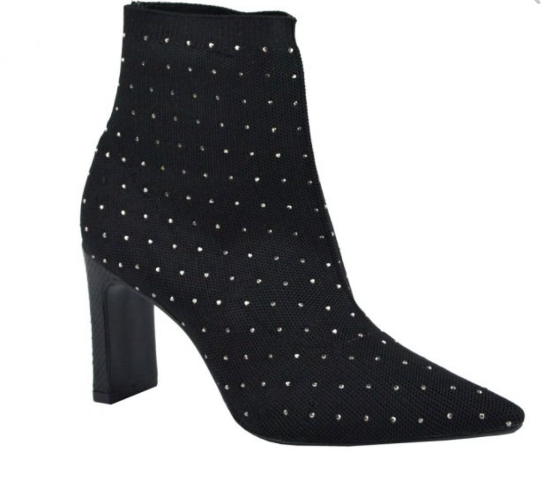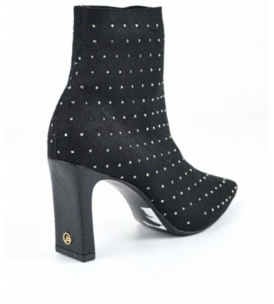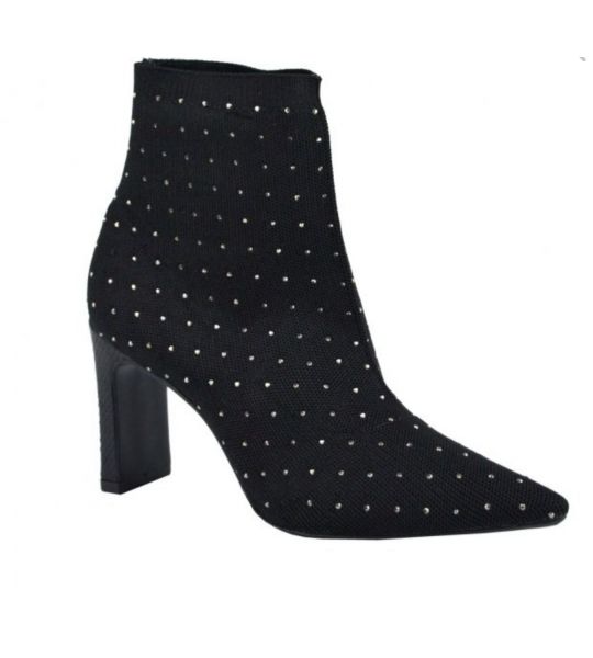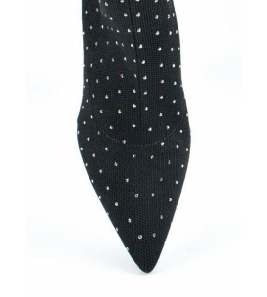 Bota em knit na cor preto com aplicação de hotfix prata no seu acabamento. O salto barra alto traz o detalhe da mini mandala JB em dourado.