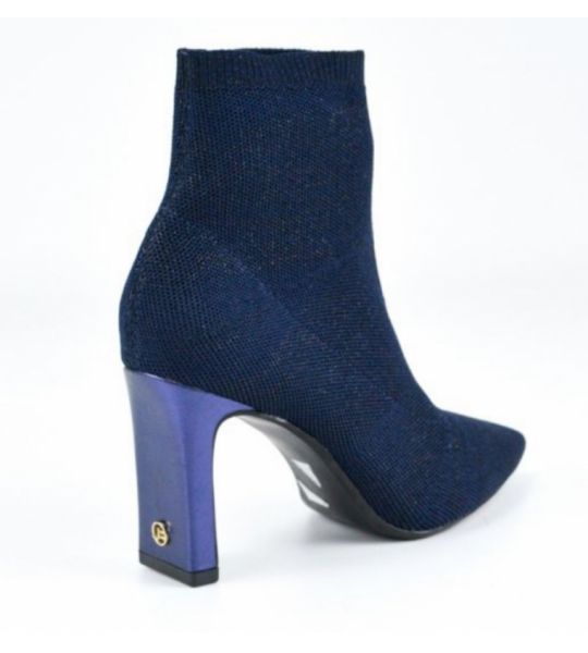 Bota em knit na cor azul marinho com brilho e salto barra alto em couro que traz o detalhe da mini mandala JB em dourado.
