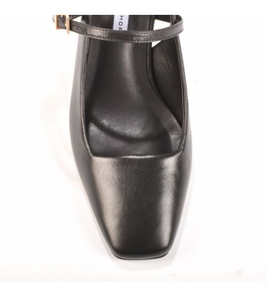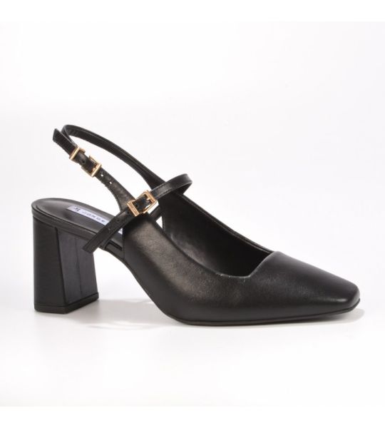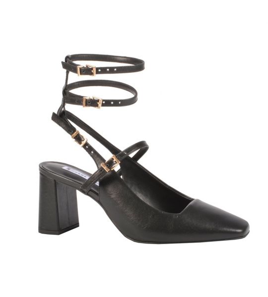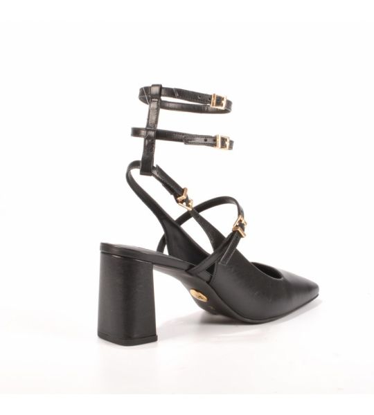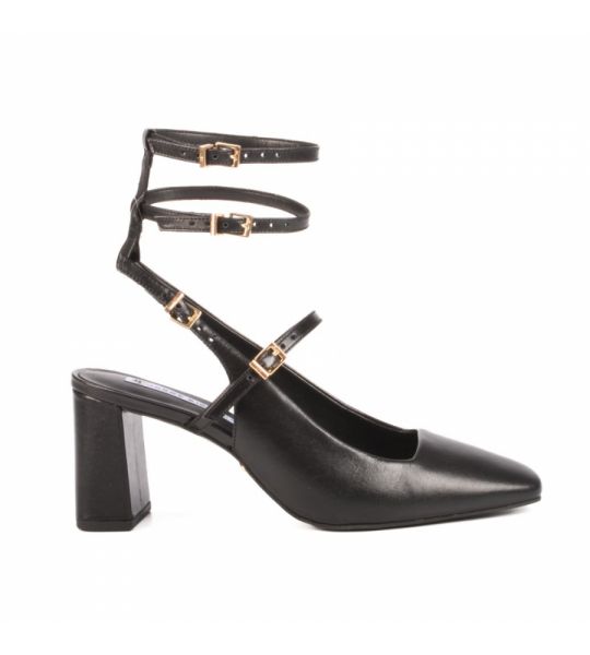 O slingback em couro preto 2 em 1 possui tiras com fivelas podendo remover duas delas quando preferir.