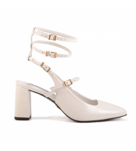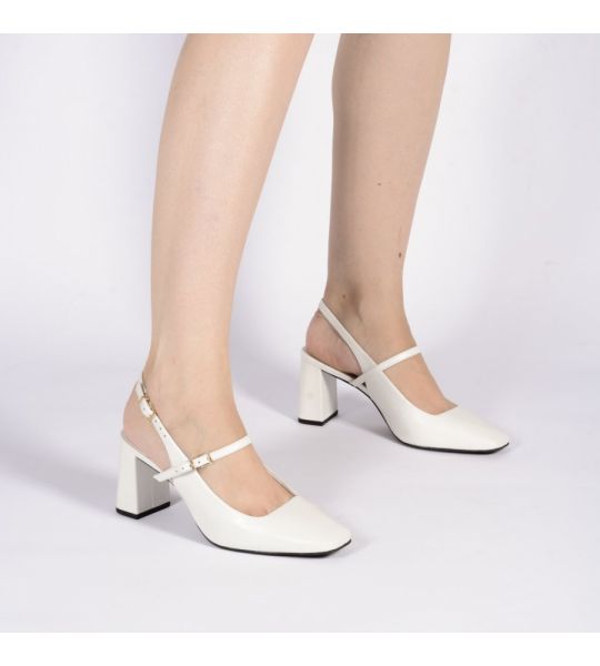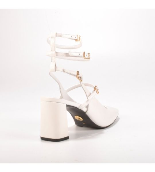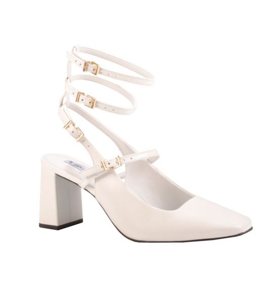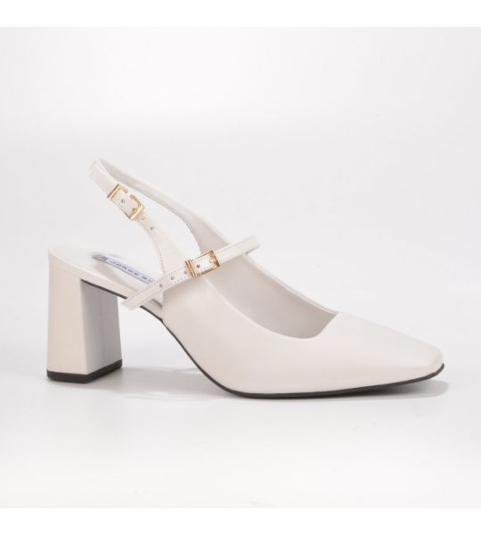 O slingback em couro branco 2 em 1 possui tiras com fivelas podendo remover duas delas quando preferir.