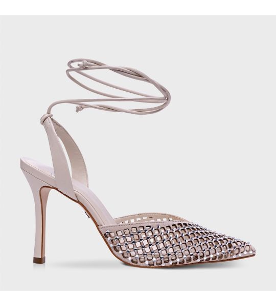 Scarpin tela em couro suede com aplicações de cristais, deixando o visual ainda mais único. Fechamento de amarração. Salto fino alto, recorte em V no sob o cabedal e parte traseira à mostra.