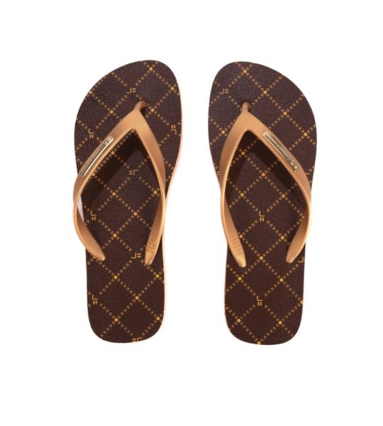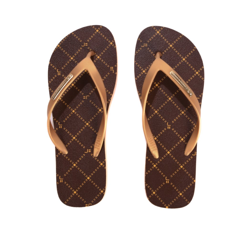 Flat (chinelo) na exclusiva estampa monograma no tom marrom com tira na cor dourada que traz o metal personalizado.